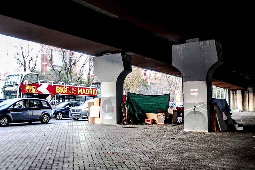 Bajo el puente, entre pilares de hormigón y sombras permanentes, se levantan chabolas de cartón y plásticos que apenas resisten la lluvia y el frío. Desde fuera, no se ven personas, no hay rostros ni voces, pero se intuye que dentro alguien respira, alguien espera. Son refugios del aislamiento, espacios mínimos donde la pobreza se oculta a la mirada pública mientras se arrastra en silencio. Allí, protegidas sólo por capas de cartón húmedo, las vidas quedan suspendidas, invisibles, como si no existieran, pero recordándonos que la exclusión no siempre grita: muchas veces simplemente sobrevive. Las personas que sobreviven bajo el puente no están ahí por elección. Muchas llegan tras haber sufrido desahucios, después de no poder asumir alquileres desorbitados o tras perder su vivienda en manos de fondos buitre que compraron bloques enteros a precio de saldo y expulsaron a familias enteras sin ofrecer alternativas reales. En Vallecas, (y en todo Madrid) estas prácticas han dejado una huella profunda, rompiendo redes vecinales y empujando a la pobreza a quienes siempre formaron parte del barrio.