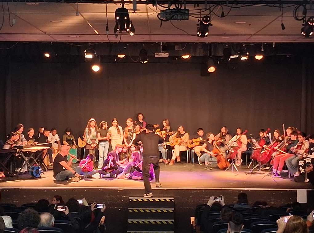 En la citada jornada se pudo asistir a una muestra del trabajo hecho en el primer trimestre por los alumnos de Primaria y los grupos intergeneracionales de tarde, pudiendo disfrutar de demostraciones de danza con un baile circular rumano, improvisaciones para ponerse en la piel de cuerpos diversos, canciones con mensaje y coreografías para la memoria. El programa incluyó algunas canciones que cada clase eligió, vinculado con el proyecto de investigación del curso. Se cantó a la familia, contra las guerras (con ‘La Frontera’, de Jorge Drexler), sobre el poder de la música (‘Los chicos del coro’, de Bruno Coulais) y la orquesta al completo tocó ‘Bella Ciao’ , como himno a favor de la libertad y contra la opresión.