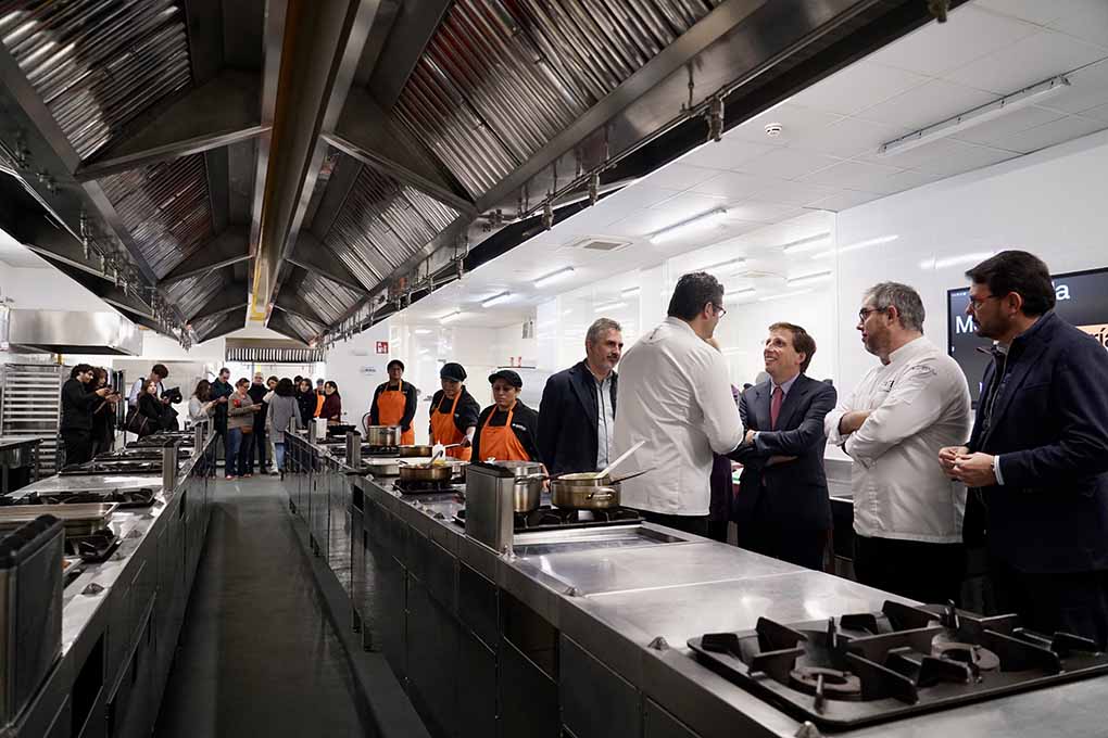 El alcalde de Madrid, José Luis Martínez-Almeida, acompañado de la delegada de Economía, Innovación y Hacienda, Engracia Hidalgo, y el concejal de Villa de Vallecas, Carlos González Pereira, visitó el 17 de noviembre la Escuela Municipal de Hostelería y Alimentación, situada en el Mercado Municipal de Santa Eugenia.