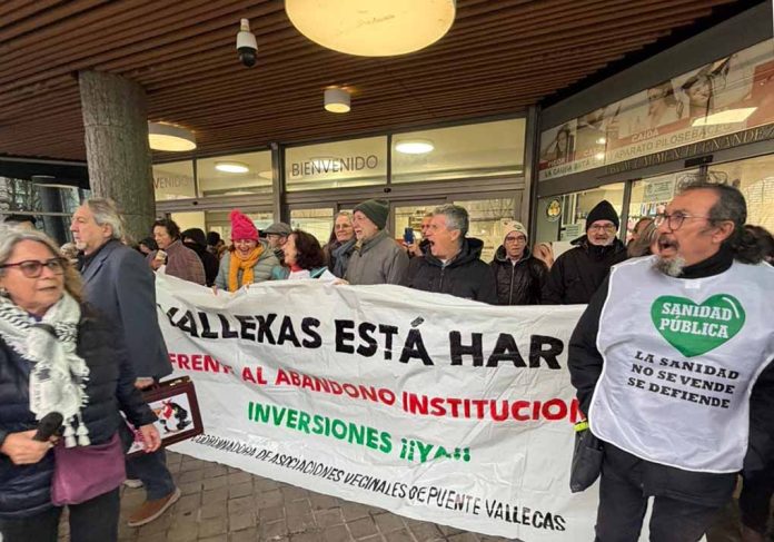 Vecinas y vecinos de Puente y Villa de Vallecas se concentraron pese a la inclemencias meteorológicas en forma de lluvia y viento frente a la Asamblea de Madrid el jueves 5 de febrero, convocados por las plataformas en defensa de la sanidad pública de ambos distritos. La protesta puso el foco en el deterioro progresivo de la sanidad pública madrileña y, en especial, en la situación del Hospital Universitario Infanta Leonor, referencia para más de 300.000 personas en Vallecas.